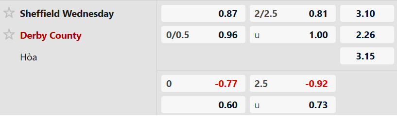 Hai đội thời gian gần đây đều đang thể hiện có sự đầu tư cho chất lượng của đội hình hàng công hoạt động hiệu quả. Minh chứng cho điều này, đối với Sheffield Wed đã có 3 trận tài trong 5 trận gần nhất thì Derby cũng có 7 trận trong 8 trận đấu gần nhất kết thúc nhiều hơn 2 bàn thắng. Hơn thế nữa, khi có liên tiếp 2 trận đối đầu gần nhất kết thúc tài nên chứng tỏ khả năng khai thác lẫn nhau hiệu quả. Với tình hình như vậy, trận đấu sắp tới dự kiến sẽ kết thúc nghiêng về tài.