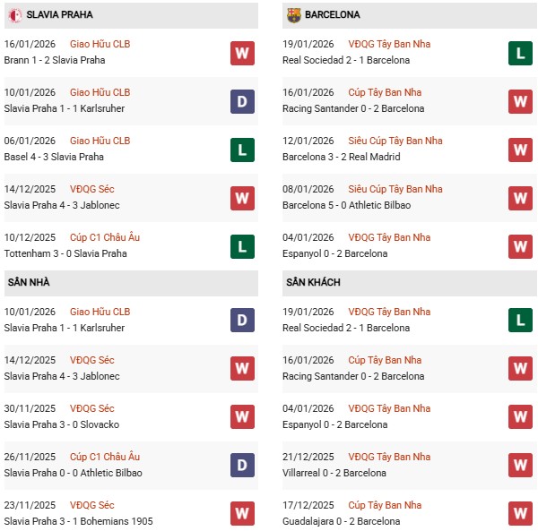 - Slavia Praha hòa 1, thua 1 trong 2 trận đối đầu Barcelona gần đây.