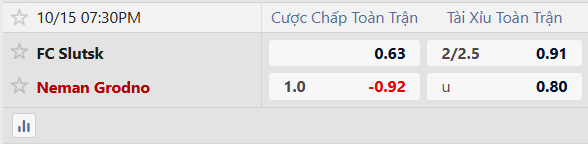 Nhận định bóng đá Slutsk vs Neman Grodno, 19h30 ngày 15/10, vòng 19 VĐQG Belarus, sân Haradski. Trong 4/5 vòng đấu gần nhất Slutsk đều làm buồn lòng giới đầu tư khi thua kèo, trong khi đó 2 trận gần đây Neman Grodno đều thắng kèo.