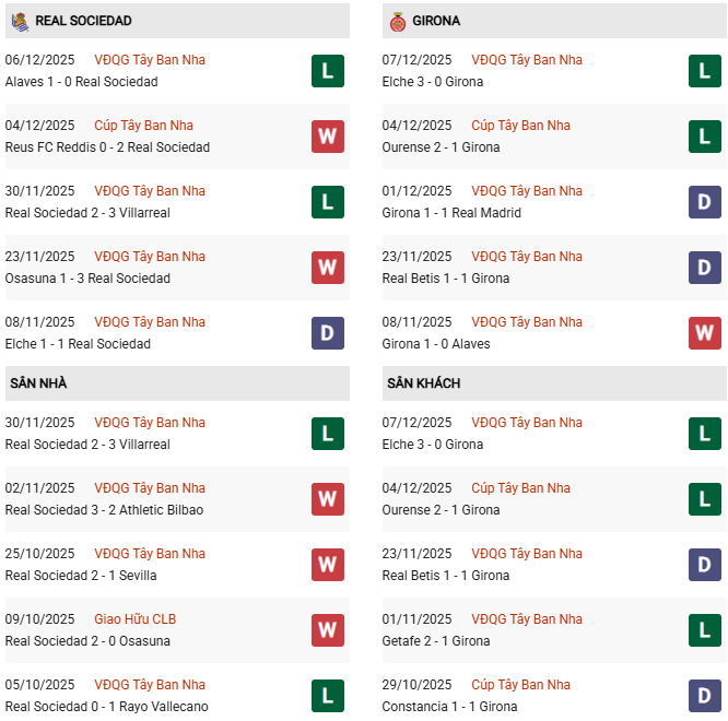Girona đã trải qua 10 trận không thắng trước Real Sociedad, trong đó có 6 trận hòa, vì vậy chuyến làm khách tới đây sẽ thực sự khó khăn với họ. Đội bóng xứ Catalan có thành tích 2 chiến thắng, 6 trận hòa và 7 trận thua sau 15 trận đấu tại giải VĐQG mùa này, với 12 điểm, xếp thứ 18 trên bảng xếp hạng, kém Mallorca 2 điểm (đội xếp thứ 17) ở vị trí an toàn.