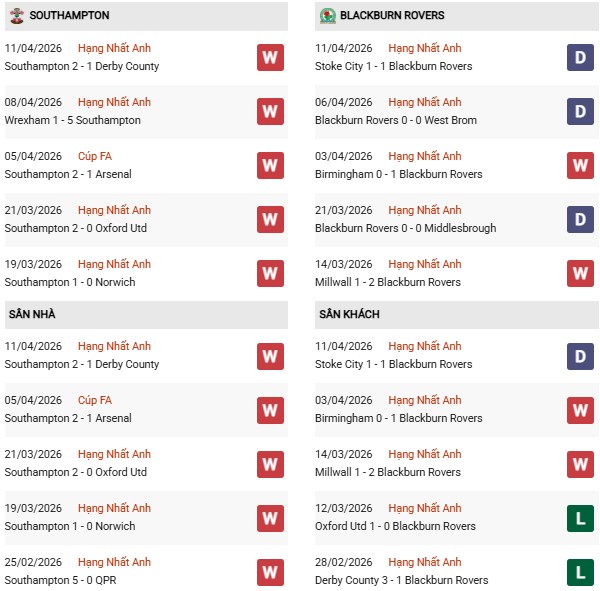 - Trên sân nhà, Southampton thắng 3, thua 1 trước Blackburn.