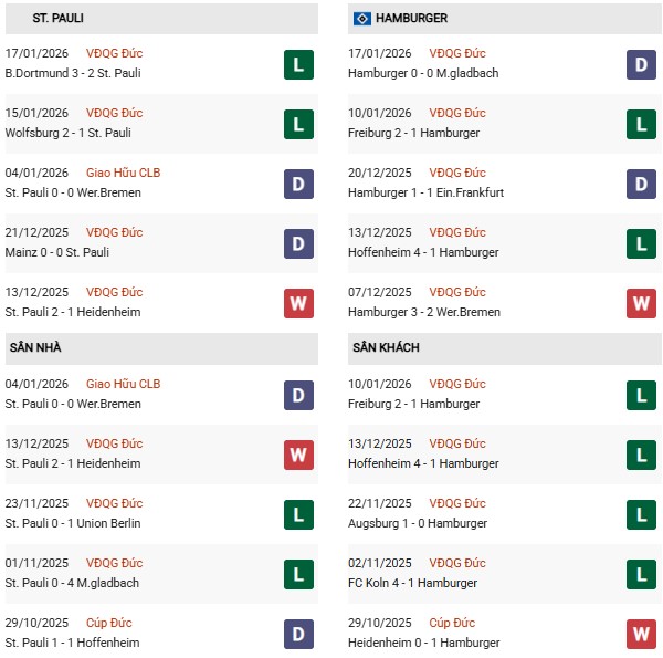 - St Pauli thắng 5, hòa 2, thua 3 trong 10 trận gặp Hamburger gần đây.
