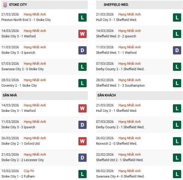 - Stoke thắng 4, hòa 3, thua 3 trong 10 trận gặp Sheffield Wed gần đây.