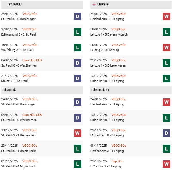 Leipzig hoàn toàn có thể coi chiến thắng trước Heidenheim là cú hích để trở lại với quỹ đạo chiến thắng. Chuyến hành quân ở trận đấu bù vòng 16 Bundesliga, về mặt lý thuyết đối với họ không quá khó khăn. St.Pauli chỉ là đội đang vật lộn trụ hạng. Cụ thể, đội chủ nhà mới giành được vỏn vẹn 3 chiến thắng sau 18 lượt trận và hiện đang xếp thứ 2 từ dưới lên tại Bundesliga, sau Heidenheim.