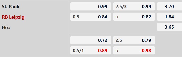 Tối đa 2 bàn: 5/6 lần đối đầu giữa 2 đội gần đây đều kết thúc với tối đa 2 bàn thắng. Tình trạng tương tự xảy ra ở 3/4 trận sân nhà gần nhất của St.Pauli. Trong 4 trận sân khách gần đây của Leipzig, có 3 trận họ không ghi quá 1 bàn thắng.