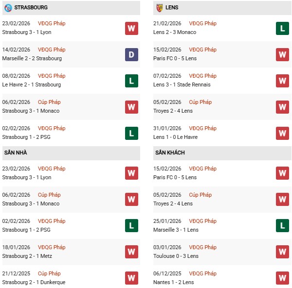 - Trên sân nhà, Strasbourg thắng 3, thua 2 trước Lens.