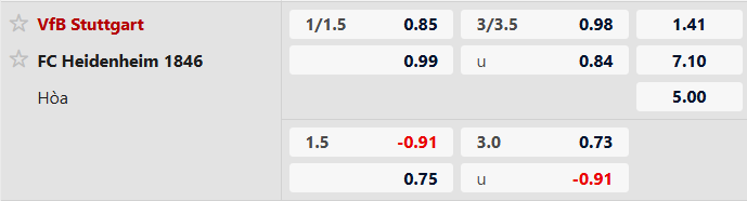Stuttgart đã có khởi đầu tương đối ổn tại Bundesliga với 3 chiến thắng sau 5 vòng, ghi tổng cộng 7 bàn. Ở chiều ngược lại, Heidenheim lại khởi đầu đầy khó khăn khi để thua 4/5 trận đầu tiên. Thành tích sân khách càng khiến người hâm mộ Heidenheim lo lắng. Lịch sử đối đầu gần đây cũng không ủng hộ Heidenheim. Tháng 12 năm ngoái, Stuttgart đã thắng thuyết phục 3-1. Với mức kèo Stuttgart chấp 1 1/4 bàn, lựa chọn đội chủ nhà vẫn được xem là đáng tin cậy hơn.