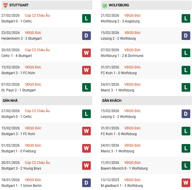 - Trên sân nhà, Stuttgart thắng 4, thua 5 trước Wolfsburg.