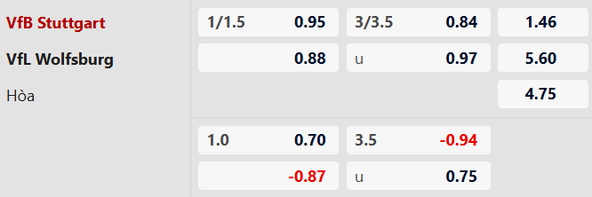 Stuttgart thắng theo châu Á: Stuttgart thắng 5/8 trận gần nhất, thắng 3/4 trận sân nhà vừa qua tại Bundesliga. Còn Wolfsburg thua 5/6 trận gần đây, thua 3/4 chuyến làm khách gần nhất. Vì thế, có thể tin vào Stuttgart ở trận này.