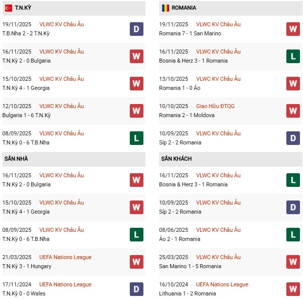 - Trên sân nhà, Thổ Nhĩ Kỳ thắng 1, thua 1 trước Romania.