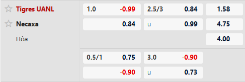 Chủ nhà Tigres UANL đang là địa chỉ khá uy tín theo thống kê kèo châu Á với 4/5 trận đấu gần đây giành chiến thắng. Thành tích này hoàn toàn trái ngược so với Club Necaxa, đội để thua kèo 7/8 trận vừa qua. Chưa kể, trận đối đầu gần nhất xuất hiện kèo chấp 1 trái như trận này, Tigres UANL thắng cách biệt trước Club Necaxa và kịch bản này có thể lặp lại.