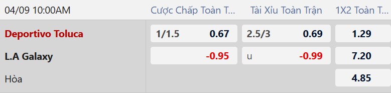 Mức chấp 1 1/4 bàn cho thấy giới chuyên môn đánh giá rất cao khả năng thắng trận của Toluca. Đây là điều dễ hiểu khi đại diện Mexico luôn chơi cực tốt trên sân nhà, đồng thời sở hữu hàng công đạt hiệu suất cao với 6 bàn trong 2 trận gần nhất tại Cúp C1 CONCACAF. Trong khi đó, LA Galaxy thường gặp nhiều khó khăn mỗi khi thi đấu xa nhà trước các đối thủ có cường độ pressing mạnh.