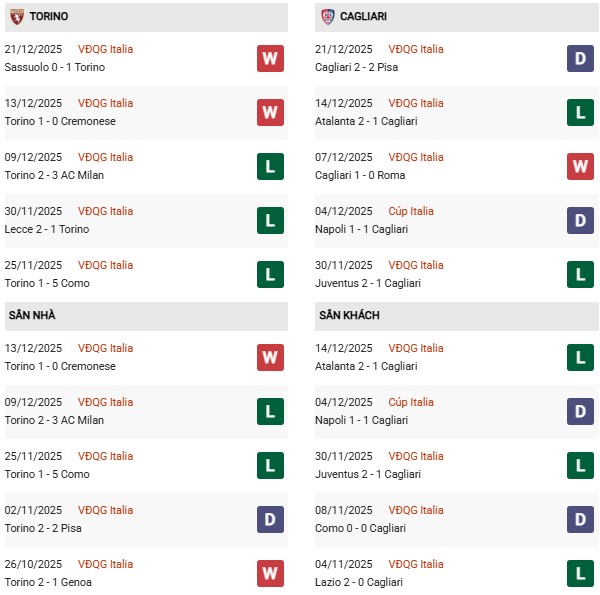 - Trên sân nhà, Torino thắng 4, thua 2 trước Cagliari.