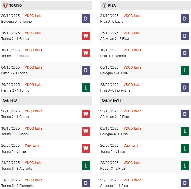 - Trên sân nhà, Torino thắng 1, thua 1 trước Pisa.