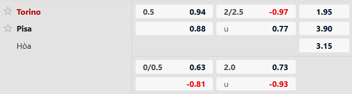 - Torino thắng 1, hòa 1 trong 2 trận gặp Pisa gần đây.