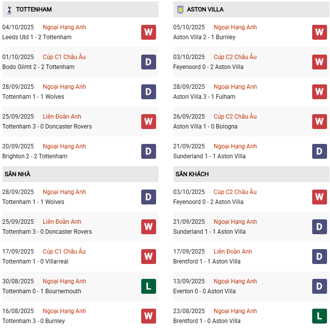 Aston Villa cho thấy sự cải thiện rõ rệt ở khâu tấn công, khi ghi bàn trong cả 6 trận gần nhất trên mọi đấu trường. Dẫu vậy, hàng thủ của họ vẫn để lộ sơ hở, không thể giữ sạch lưới ở 4 trong số những trận này, và 2/3 trận gần nhất đều có tổng tỷ số vượt mốc 2.5 bàn. Mùa trước, lợi thế sân nhà đóng vai trò rõ rệt, Tottenham thắng đậm 4-1 tại London, trong khi Aston Villa đáp trả bằng chiến thắng 2-0 ở trận lượt đi trên sân của mình.
