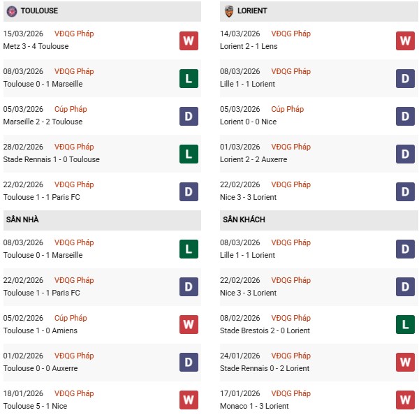 - Toulouse thắng 3, hòa 5, thua 2 trong 10 trận gặp Lorient gần đây.