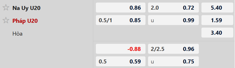 Sàn giao dịch châu Á ghi nhận mức kèo U20 Na Uy được chấp 1/2 trái, tỷ lệ mà đội bóng này đang rất có duyên, khi 2 trận gần đây xuất hiện họ đều là đội mang niềm vui cho các nhà đầu tư châu Á. Với U20 Pháp, đội bóng này đang có thành tích thua kèo châu Á ở 3/4 trận vừa qua.