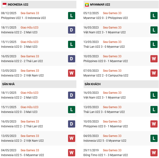 - U22 Indonesia thắng 2, hòa 2 trong 4 trận gặp U22 Myanmar gần đây.