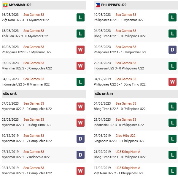 - U22 Myanmar toàn thắng cả 3 trận đối đầu U22 Philippines gần đây.