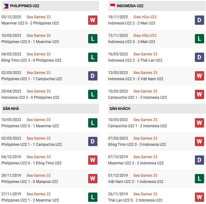 - U22 Philippines thua cả 2 trận đối đầu U22 Indonesia gần đây.