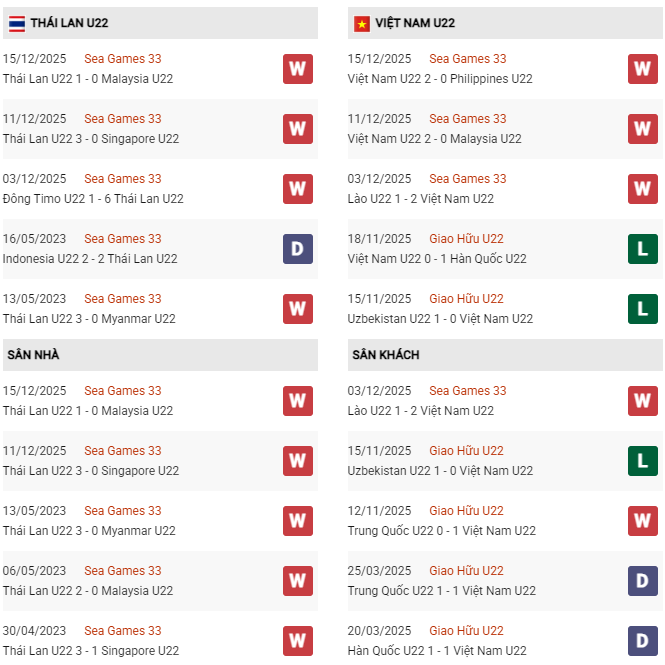 - 5 lần gần nhất gặp nhau, U22 Thái Lan thua 3 và hòa 2 trước U22 Việt Nam.