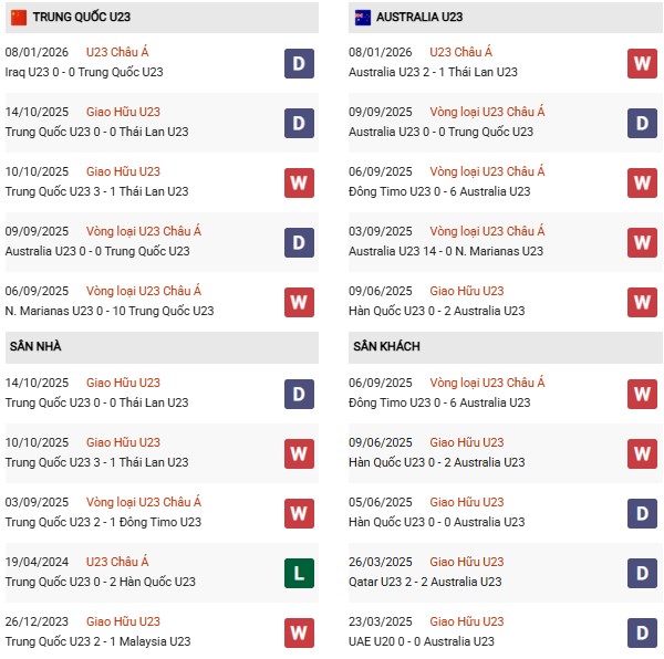 - U23 Trung Quốc thắng 2, hòa 1 trong 3 trận gặp U23 Australia gần đây.