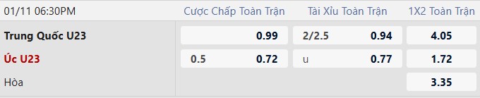 Ít bàn thắng: 3 trận gần nhất của Trung Quốc chỉ có nhiều nhất 1 bàn thắng được ghi. Ở lần gặp nhau gần nhất hồi tháng 9 tại vòng loại, U23 Trung Quốc cũng cầm hòa U23 Australia với tỷ số 0-0. Trận đấu tới nhiều khả năng cũng không có nhiều bàn thắng.