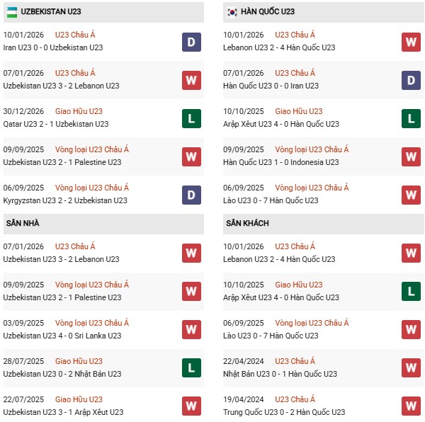 - U23 Uzbekistan hòa 5, thua 5 trong 10 trận gặp U23 Hàn Quốc gần đây.