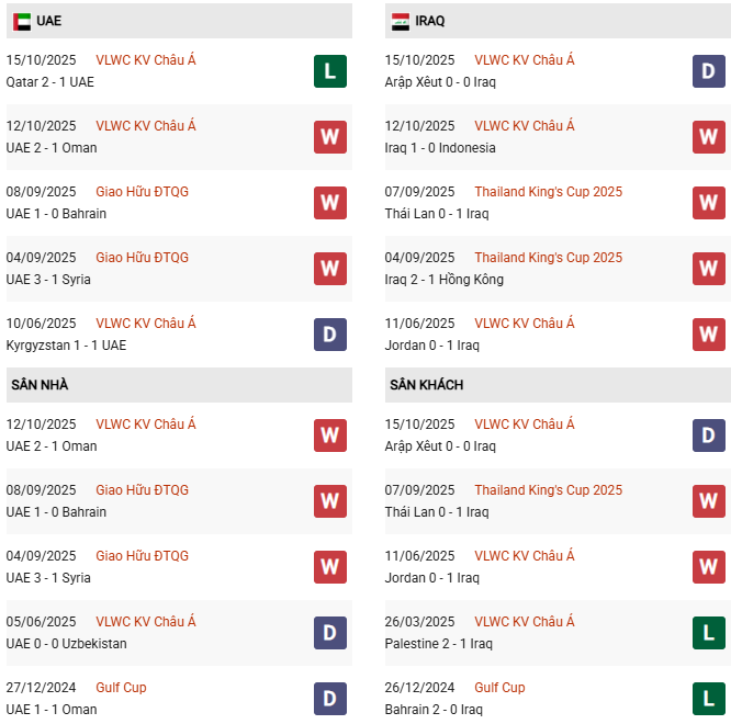 - Trên sân nhà, UAE thắng 4, thua 2 trước Iraq.
