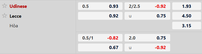 Udinese được xếp cửa trên với tỷ lệ chấp 1/2 bàn cho cả trận. Dù họ có ưu thế nhất định nhờ chuỗi 3 chiến thắng liên tiếp trước Lecce và đang duy trì mạch 4 trận bất bại trong cặp đấu này, nhưng phong độ trên sân Friuli lại khiến giới mộ điệu không yên tâm. Với những gì hai đội thể hiện gần đây, khả năng cao cuộc chạm trán sắp tới khép lại kết quả bất phân thắng bại. Do đó, lựa chọn kèo dưới có thể là phương án an toàn hơn.