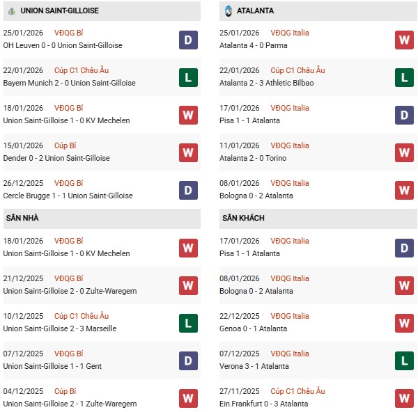 Ít bàn thắng: 7 trận liên tiếp gần đây của Union SG đều có không quá 2 bàn thắng được ghi, trong đó hàng thủ của họ có 5 trận giữ sạch lưới. Với Atalanta, 6/8 trận vừa qua của đội khách cũng có tối đa 2 pha làm bàn.