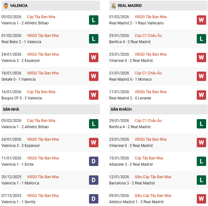 - Valencia thắng 2, hòa 2, thua 6 trong 10 trận gặp Real Madrid gần đây.