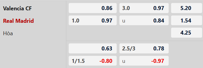 Tối đa 1 bàn hiệp 1: 3/4 lần gặp giữa 2 đội gần đây trên sân của Valencia đều chỉ có nhiều nhất 1 bàn thắng trong hiệp 1. Tình trạng tương tự xảy ra ở 10/11 trận gần đây của Valencia ở La Liga và 7 trận gần nhất của Real Madrid cũng ở La Liga.