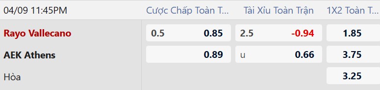 Mức chấp 1/2 bàn phản ánh đúng tương quan khi Vallecano có lợi thế sân nhà và đang chơi khá ổn định. AEK Athens sở hữu hàng thủ chắc chắn, nhưng việc phải làm khách tại Tây Ban Nha luôn là thử thách rất lớn. Vallecano nhiều khả năng sẽ kiểm soát tốt thế trận và tận dụng sức ép từ khán giả nhà để hướng tới chiến thắng tối thiểu.