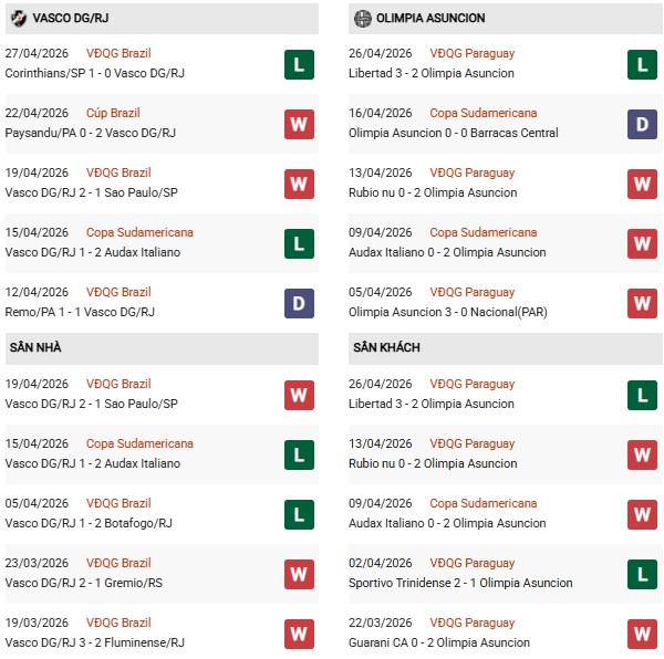 Vasco da Gama đang thể hiện hai bộ mặt trái ngược hoàn toàn giữa đấu trường quốc nội và châu lục. Tại Copa Sudamericana, đại diện Brazil đang gây thất vọng lớn khi đứng cuối bảng với chỉ 1 điểm sau 2 lượt trận. Theo dữ liệu, phong độ gần đây của Vasco khá phập phù khi vừa để thua 0-1 trước Corinthians.