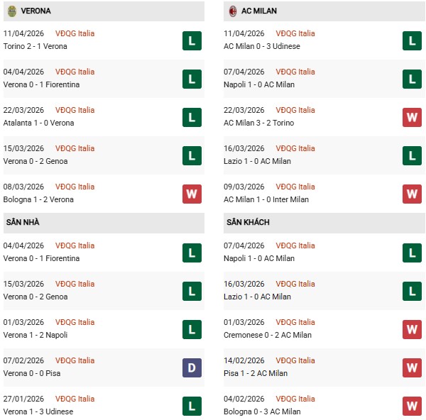 - Verona toàn thua trong 10 trận đối đầu AC Milan gần đây.