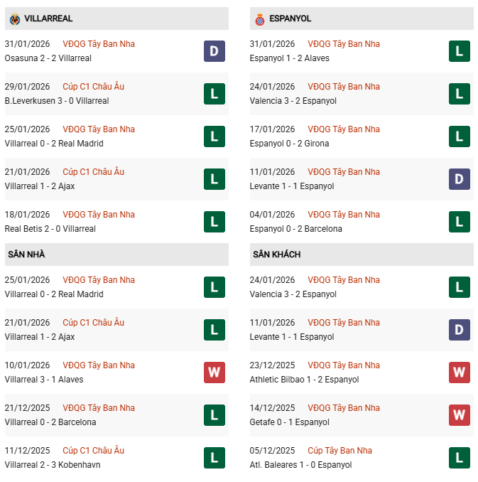 Thống kê phong độ Villarreal vs Espanyol: