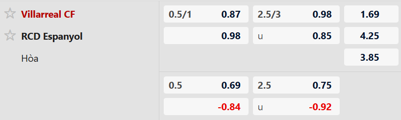 Phong độ của cả Villarreal và Espanyol đều không tốt nhưng đội chủ nhà đỡ tệ hơn đối thủ. Họ cũng là những người giành chiến thắng ở cả 3 lần gặp nhau gần nhất nên sẽ không có gì ngạc nhiên nếu phần thắng trận tới sẽ thuộc về họ. Chính vì vậy với tỉ lệ kèo Villarreal chấp 0.75 thì cơ hội chiến thắng của họ là vô cùng khả quan.
