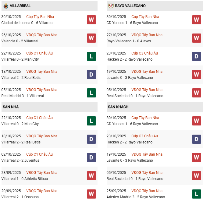 - Villarreal thắng 6, hòa 2, thua 2 trong 10 trận gặp Rayo Vallecano gần đây.