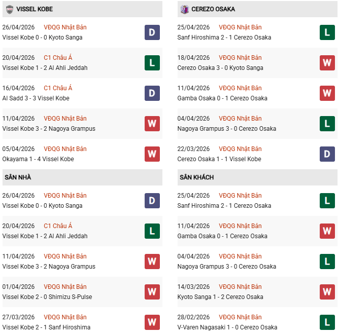 - Trên sân nhà, Vissel Kobe thắng 4, thua 3 trước Cerezo Osaka.