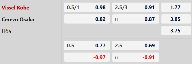 2 hoặc 3 bàn cả trận: 3/4 cuộc đối đầu gần nhất, 5/8 trận gần đây của Vissel Kobe và 6/7 trận vừa qua của Cerezo Osaka đều có từ 2 đến 3 bàn cả trận.