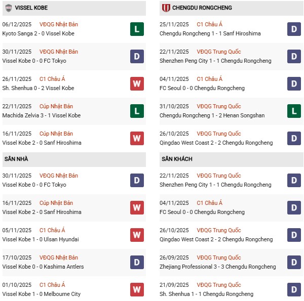 Phong độ chung của đội bóng trong 10 trận vừa qua không quá thuyết phục (thắng 3, hòa 4, thua 3) nhưng ở sân chơi châu Á, Kobe vẫn duy trì được sự ổn định nhờ lối chơi kỷ luật, pressing mạnh và khả năng tận dụng cơ hội tốt của tuyến trên. Trước đối thủ yếu hơn như Chengdu, đội chủ nhà được đánh giá vượt trội và có khả năng kiểm soát hoàn toàn thế trận.