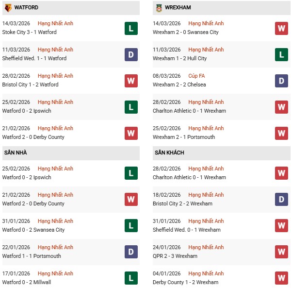 Thứ nhất, Wrexham thi đấu sân khách cũng rất tốt. Họ bất bại trong 6 chuyến hành quân trở lại đây, bao gồm 5 chiến thắng và 1 trận hòa. Điều này sẽ tiếp thêm sức mạnh cho đoàn quân của HLV Phil Parkinson khi đá trên sân Vicarage Road.