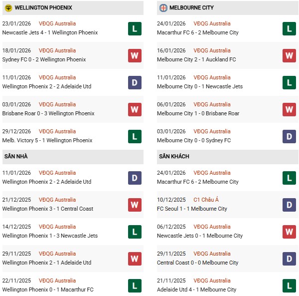 Phong độ của Wellington Phoenix và Melbourne City không có sự chênh lệch vào lúc này khi cùng thắng 2/5 trận gần nhất. Trên sân nhà, Wellington Phoenix thắng 5/9 gần nhất còn Melbourne City thắng 3, hòa 4 và thua 2 ở cùng thời gian.