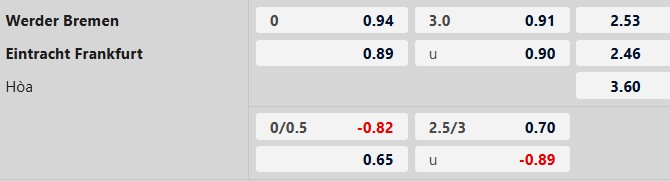 Frankfurt ghi bàn hiệp 1: Frankfurt đã ghi ít nhất 1 bàn trong hiệp 1 ở 4/5 trận gần nhất. Đặc biệt, Frankfurt còn làm được điều đó trong 5/8 lần so tài gần đây với Werder Bremen trên mọi đấu trường.