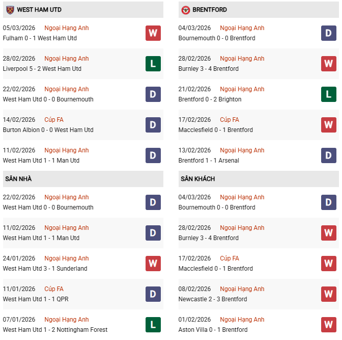 - 5 lần gần nhất gặp nhau, West Ham thắng 1 hòa 1 và thua 3 trước Brentford.