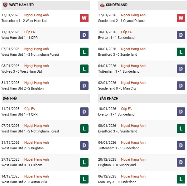 - West Ham thắng 4, hòa 4, thua 2 trong 10 trận gặp Sunderland gần đây.