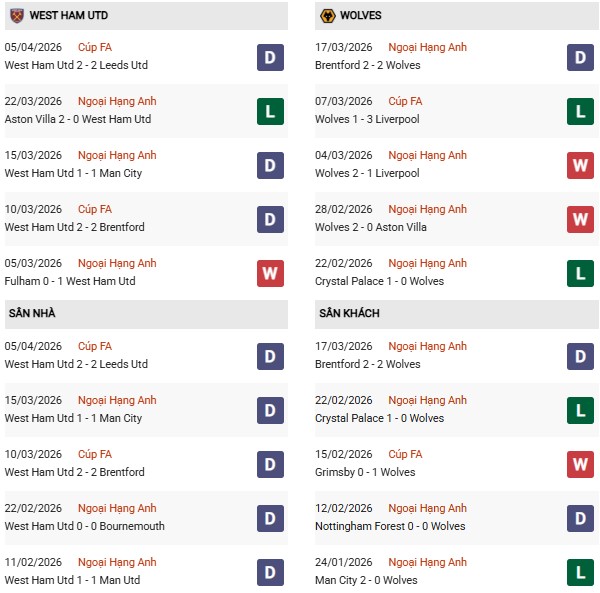 - West Ham thắng 5, thua 5 trong 10 trận gặp Wolves gần đây.