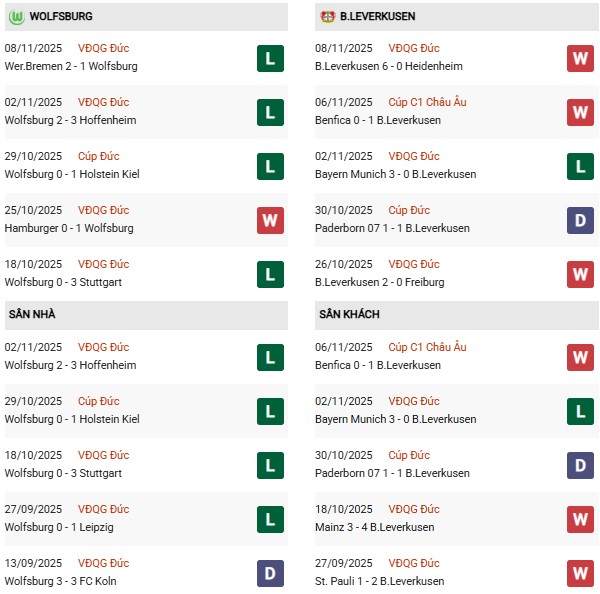 - Trên sân nhà, Wolfsburg thắng 1, thua 6 trước Leverkusen.